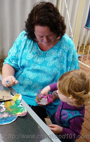 … this time a simple crayon resist with bright coloured food colouring. Immy enjoyed it so much that she asked me to cut out two more butterflies which she painted, one for her great-grandmother and the other for her aunt.